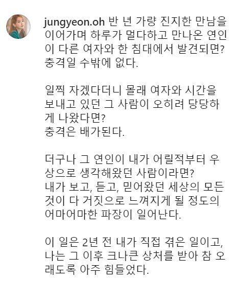 2년 전 직접 겪은 일이라고 밝힌 오정연은 "나는 그 이후 크나큰 상처를 받아 참 오래도록 아주 힘들었다"라고 말했다.