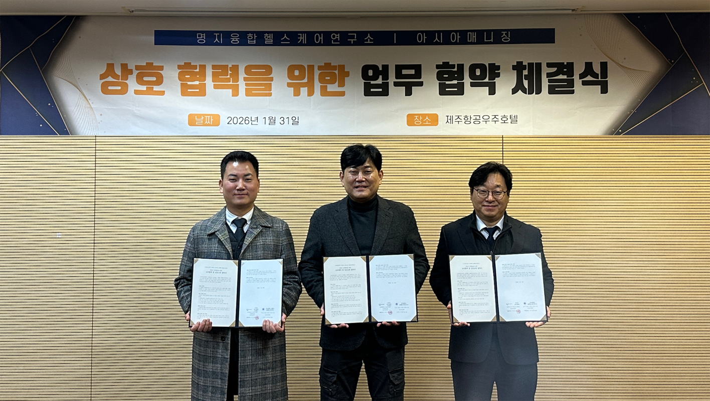 명지대학교(총장 임연수)의 융합헬스케어연구소(소장 이재범)는 2026년 1월 31일, 아시아금융그룹(회장 박근범) 호텔사업부와 산학협력 및 공동 발전을 위한 업무협약을 체결했다고 밝혔다. 이번 협약과 관련해 양 기관은 융합헬스케어 연구와 헬시에이징을 위한 생애주기 변화 연구를 기반으로, 외국인 관광객을 포함한 글로벌 관광 수요를 대상으로 한 여가 및 웰니스 프로그램 개발과 연계 방안과 발전 방향을 모색하기로 하였다. 이를 통해 지역사회 관광 환경 변화에 대응하는 헬스케어 융합 서비스 모델 구축 가능성에 대해서도 논의하고 산학 연구 및 의견 교환을 진행했다.