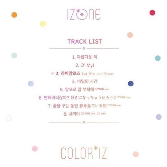 트랙리스트에 따르면 신곡 ‘아름다운 색’, ‘오 마이(O’My!)’, ‘라비앙로즈(La Vie en Rose)’, ‘비밀의 시간’을 비롯해 ‘앞으로 잘 부탁해’, ‘반해버리잖아?’, ‘꿈을 꾸는 동안’, ‘내꺼야’ 등 Mnet ‘프로듀스 48’ 경연곡을 아이즈원 버전으로 재편한 트랙이 함께 수록된다.