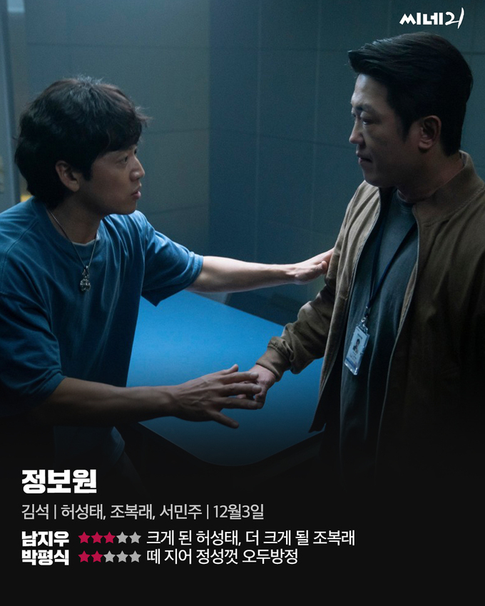 징계와 강등이 이어지는 조직 생활에 염증을 느낀 중년 형사 남혁(허성태)은 제복을 벗을 작정이다. 그와 아슬아슬한 공생관계를 이어온 정보원 태봉(조복래) 역시 자신의 신분을 청산하려는 계획을 세우지만, 이들을 기다리고 있는 것은 중대한 범죄 사건이었다. <정보원>은 북미 장르물에서 익숙한 투톱 구도인 경찰과 정보원의 관계를 그리며 이들의 직업적 긴장감을 핵심 동력으로 삼는 코미디영화다. 내뱉는 단어의 억양까지 치밀하게 계산한 듯한 허성태와 조복래, 두 배우의 출중한 연기와 케미스트리는 앞으로의 시리즈화를 기대하게 한다. 범죄 에피소드 자체도 여러 갈래의 줄기가 논리적으로 연결되어 있다는 점이 만족스럽다. <범죄도시>, <베테랑> 시리즈와 차별화된 매력을 선사하며 코미디 듀오 형사물로서 자신만의 자리를 확고히 한다.
