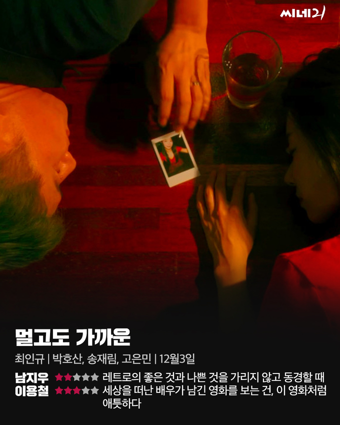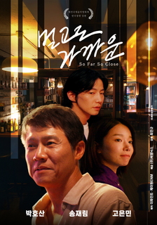 재개발의 그림자가 드리운 동네에서 오래된 LP 바를 지키는 준호(박호산) 앞에 한 손님(송재림)이 나타난다. 함께 술잔을 기울이던 두 사람은 몇달 전 세상을 떠난 연주(고은민)를 통해 서로 연결되어 있음을 알게 된다. 영화 <멀고도 가까운>은 떠나간 연인을 애도하는 주인공을 중심으로 로맨스, 미스터리, 그리고 판타지 장르가 혼합돼 있다. 비선형적으로 파편화된 시간 구성과 이질적인 편집 리듬, 그리고 주요 배우들의 1인다역 설정을 통해 실험성이 강조되지만, 연출자가 그 실험을 성공적으로 실행했는지는 의문이다. 형식적 야심과 결과물 사이의 아쉬운 간극에도 불구하고, 영화에 독특한 질감을 부여하는 재즈 음악과 1990년대 한국 시네필리아 문화를 상징하는 크고 작은 기호들을 찾는 재미를 놓치지 말자. 2024년 제천국제음악영화제 한국경쟁 장편부문 상영작.