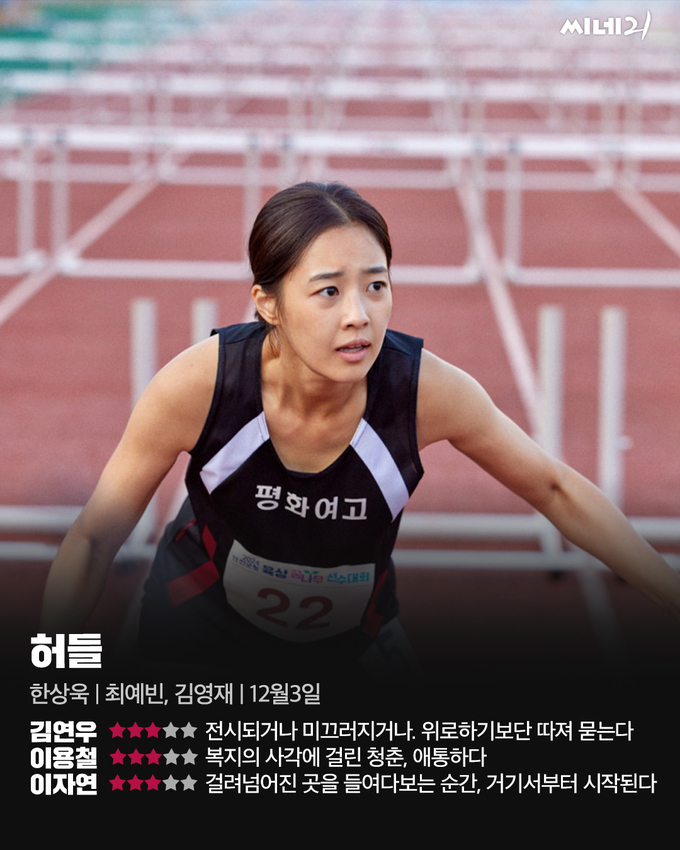 고등학생 허들 선수 서연(최예빈)은 군청 실업팀 입단을 목표로 훈련 중이다. 어느 날 유일한 가족인 아빠(김영재)가 뇌졸중으로 쓰러지고, 서연은 수술동의서엔 서명할 수 없고 입원포기각서엔 서명이 가능한 10대 보호자가 된다. 부녀에게 닥친 일들은 서류로 증명되지 않는다. 친족단위 돌봄이 기본값인 사회, 선별적 복지제도 사이로 미끄러진 서연은 병원비도 간병도 스스로 해결해야 한다. 그런 서연에겐 실업팀 선발이 절실하지만, 친구 민정(권희송)의 입단이 내정된다. 민정의 가난은 서류로 증명되어, 그는 ‘불쌍한 아이’로 홍보돼왔고 실업팀 내정도 그 연장선이다. <허들>은 다소 집요하게, 끝없이 달리고 또 가로막히는 감각이 서연의 일상을 잠식하는 과정을 보여준다. 소중한 가족을 돌보는 일이 어째서 홀로 넘는 허들에 은유되고 마는가. 영화의 물음은 서연을 돕지 못한 어른들을 경유해 화면 밖으로 뻗는다.