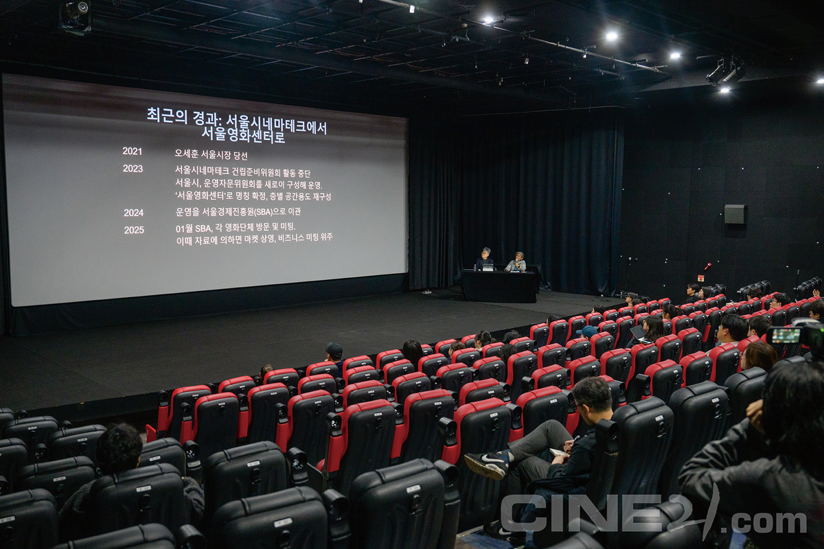 김숙현 한국시네마테크협의회 사무국장은 20년간 이어져온 시네마테크 전용관 추진 과정을 소개하며, 공공 시네마테크가 비상업 영화 문화의 공동 자산임을 역설했다. 서울영화센터와 기능이 중복된다는 이유로 지원이 끊긴 영화 공동체의 목소리도 이어졌다. ‘오!재미동을 지키고 싶은 사람들’의 박수려 대표는 “지역성과 역사성은 물론 기본적인 규모 차이조차 고려하지 않는 행정이 공동의 기억과 자원을 단절”시키고 있음을 지적했다. 이처럼 서울영화센터 논란은 한 공간의 용도 변경 문제를 넘어 서울시의 문화정책이 얼마나 부조리한 원리와 절차 위에서 운영되는지를 논하는 담론으로 확장됐다.