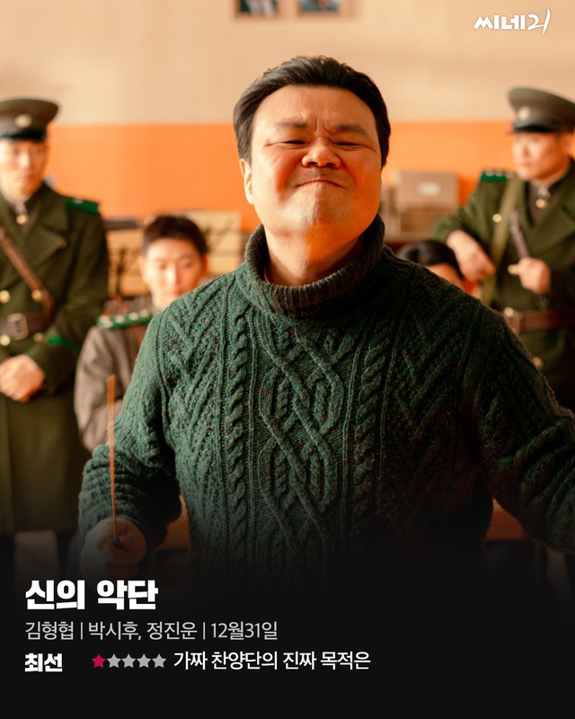 국제사회로부터 거액의 지원금을 받기 위해 가짜 찬양단을 만들어 부흥회를 열려는 북한 보위부. 당의 명령을 받은 장교 박교순(박시후)은 노래와 연주가 모두 가능한 악단을 수배해 찬양단을 조직한다. 부흥회 준비에 열중하던 그는 대위 김태성(정진운)과 대립하며 충돌을 빚지만 악단과 함께 노래하고 연주하며 연습에 매진하는 동안 마음에 변화가 생긴다. 부흥회가 다가오면서 이들은 운명이 보장되지 않는 예기치 못한 상황을 맞는다. <신의 악단>은 신앙의 힘을 전면에 내세운 작품으로 종교적 감동을 공유할 수 있는 관객에게 더 의미가 있다. 가짜 찬양단에서 비롯한 서사의 확장이나 영화 자체가 주는 즐거움보다는 종교적 메시지 전달에 무게를 두었으며 다른 서사를 곁들이지 않고 오직 이 방향만을 끝까지 고수한다.