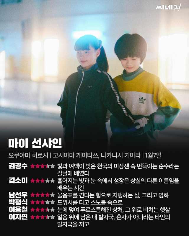 만 22살에 데뷔작 <나는 예수님이 싫다>로 제66회 산세바스티안국제영화제 신인감독상을 받은 오쿠야마 히로시 감독의 두 번째 작품 <마이 선샤인>은 전작의 향취를 잇는다. 거기에는 차분한 카메라워크, 포근한 필름 룩의 질감, 낯익은 전개 뒤에 따라오는 오묘한 파국까지 그의 인장처럼 찍혀 있다. 이번에도 어린이의 세계를 조명한 그는 이르게 이별한 친구를 떠올리며 첫 영화를 만들었듯, 오래전 피겨스케이팅을 배우던 경험으로부터 이 영화를 구상했다고 한다. 감독 스스로 전작에서 아쉽게 여긴 어른의 비중을 늘렸고, 팬데믹을 겪는 동안 귓가에 꽂힌 부부 듀오 험버트 험버트의 곡 <ぼくのお日さま>에서 제목과 인물 설정을 따오기도 했다.
