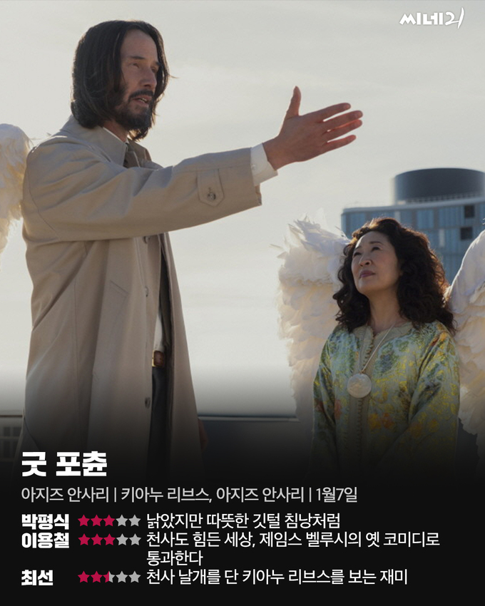 하급 천사 가브리엘(키아누 리브스)은 길 잃은 영혼을 구원하고 싶다는 마음으로 생계형 노동자 아지(아지즈 안사리)와 벤처투자자 제프(세스 로건)의 삶에 개입해 인생을 맞바꾼다. 하루아침에 전혀 다른 일상을 살게 된 두 사람은 혼란에 빠지고 권한 밖의 일을 저지른 가브리엘은 인간으로 강등된다. 영화는 양극화된 사회와 부조리한 현실을 따뜻하고 경쾌한 리듬으로 그려내며 두 인물의 변화 과정을 따라간다. 흥미로운 점은 이 변화가 인간에게만 국한되지 않는다는 데 있다. 관찰자나 조율자의 자리에 있던 천사 역시 변화의 당사자에 포함되며 이 전환은 키아누 리브스의 변신으로 완성된다. 네오와 존 윅으로 대표돼온 침착하고 유능한 이미지의 그가 실수를 반복하는 천사가 되어 날개를 달고 등장하는 파격이 새로운 즐거움을 주는 관람 포인트다.