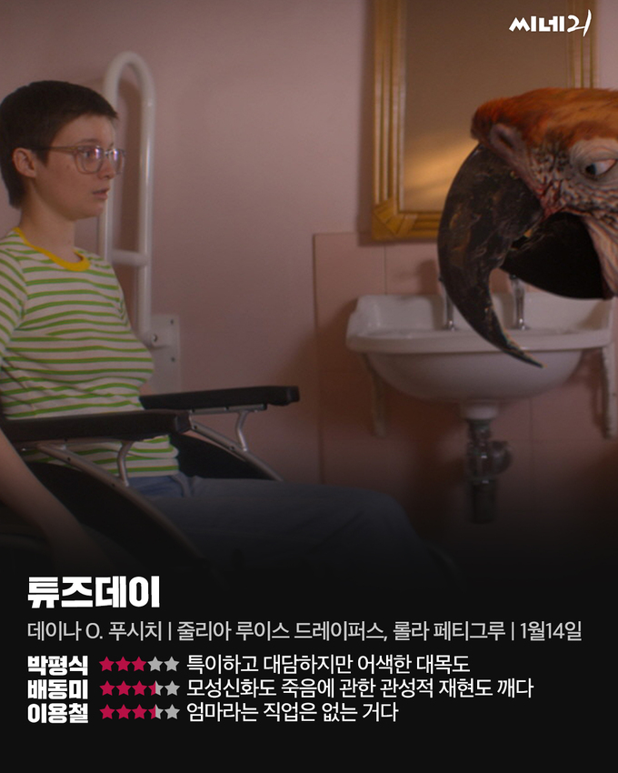 큰 병을 앓고 있는 15살 소녀 튜즈데이(롤라 페티크루)는 어느 화창한 날 죽음의 화신을 만난다. 그런데 생명을 거두는 존재가 인간처럼 보이진 않는다. 우습게도 빨간 앵무새가 이 세계의 모든 죽음을 관장하고 있다. 튜즈데이는 죽을 위기를 모면하기 위해 농담을 던지고 앵무새가 웃음을 터트리게 만든다. 한편 긴 간병으로 지친 엄마 조라(줄리아 루이스 드레이퍼스)는 튜즈데이가 곧 죽는다는 사실을 안 후로 딸을 구하고자 한다. 앵무새를 없애면 딸을 지킬 수 있을 것 같아 죽음의 전령을 붙잡아 불태우기에 이른다. 하지만 앵무새는 재 속에서도 고개를 든다. 놀란 조라는 자신도 모르게 그을린 앵무새를 입안에 밀어넣고 삼켜버린다. <튜즈데이>로 첫 장편영화를 완성한 신인감독 데이나 O. 푸시치는 과연 죽음이 없는 세상이 천국일까란 질문을 유쾌하고 창의적으로 풀어낸다. 시트콤 <사인필드>의 줄리아 루이스 드레이퍼스의 연기를 볼 수 있는 건 덤이다.