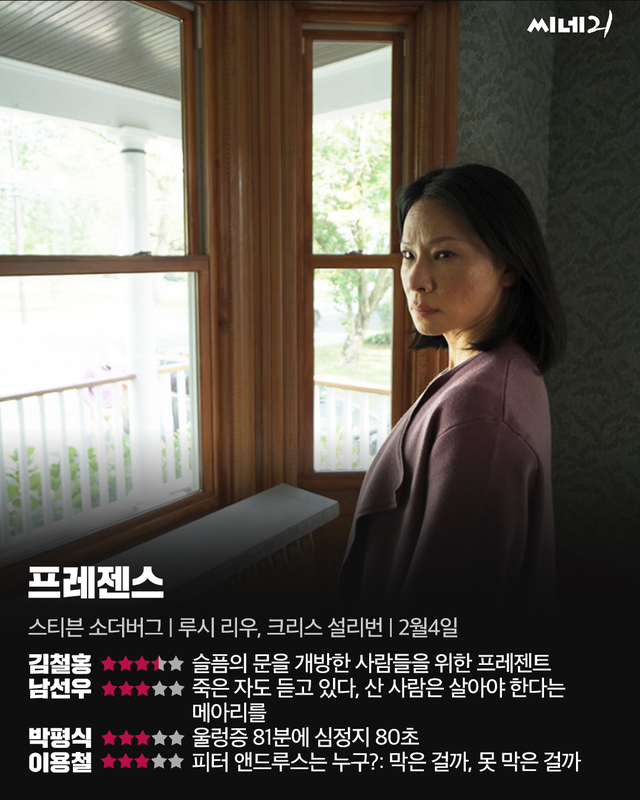 창밖 도로에는 아무도 없다. 그 창이 달린 방, 그 방 너머의 거실에도. 모든 복도와 계단을 지나 현관에 도착하기까지, 카메라는 2분 넘게 어두운 공간을 헤맬 뿐이다. 그곳이 빈집인지, 모두가 잠든 곳인지는 금세 밝혀진다. 다음 장면에서 아침이 밝자 부동산중개인이 한 가족을 이끌고 그 안에 들어오기 때문이다. 4인 가족은 부모와 남매로 이뤄져 있다. 이사에 적극적인 어머니 레베카(루시 리우)와 달리 아버지 크리스(크리스 설리번)는 아이들이 새로운 환경에 잘 적응할 수 있을지 걱정이다. 레베카는 그런 크리스에게 토로한다. “산 사람은 살아야지.” 그렇다면 이미 죽은 사람은 누구일까. 스티븐 소더버그 감독의 신작 <프레젠스>는 그 존재가 가족 사이를 맴돌고 있음을 넌지시 흘리면서 본격적인 이야기를 들려준다.