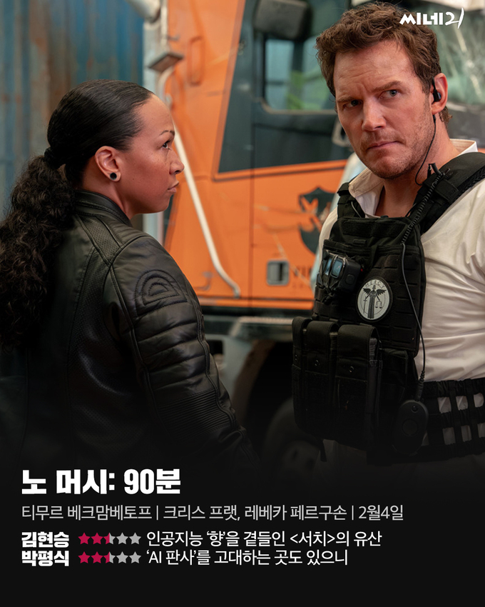 걷잡을 수 없이 치솟는 범죄율로 교도소가 포화 상태에 이르자, 미 법무부는 AI 사법 시스템 ‘머시’(Mercy) 도입을 결정한다. 인간적 감정을 배제한 채 데이터로만 판결하는 인공지능의 ‘공정함’은 기존 재판 체계의 한계를 극복할 훌륭한 대안처럼 보인다. 그러나 머시 도입을 주도했던 레이븐(크리스 프랫)이 아내 살해 혐의로 사형대에 오르며 상황은 급변한다. 레이븐은 주어진 90분 동안 무죄를 입증하려 애쓰지만, 이내 모든 증거가 자신을 향하고 있음을 깨닫는다. <노 머시: 90분>은 근미래를 배경으로 AI 사법 시스템의 열렬한 지지자가 피해자로 전락하는 과정을 그린다. 온라인 기록에 접근해 사건의 진상을 밝히는 전반적인 컨셉은 <서치>를 연상시키지만, 세계를 3D 프린팅하듯 재현하는 방식은 오히려 게임적 감각에 가깝다. 다만 AI 재판을 둘러싼 논쟁을 손쉽게 무마하며 충분한 설득력을 확보하지 못한 점은 아쉬움으로 남는다.
