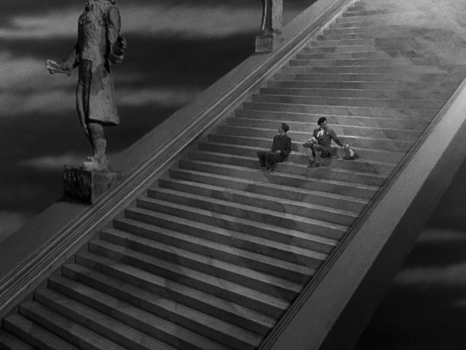 나란히 앉은 세 주인공의 뒤로 그들의 형상이 무한히 펼쳐지는 <영원>의 포스터는 마이클 파웰과 에머릭 프레스버거의 1946년 걸작 <천국으로 가는 계단>이 묘사한 림보적 이미지를 떠올리게 한다. 1940년대 초반 흥행한 필름 블랑 장르의 대표작이다. 필름 블랑은 필름누아르의 정신적, 미학적 대척점 역할을 하는 영화들로 정의된다. 누아르가 배신, 복수, 도덕적 타락으로 점철된 사회의 어둡고 냉소적인 이면을 파헤쳤다면, 필름 블랑은 낙관과 용서, 사후 세계에 대한 긍정적인 비전과 초월적 로맨스를 제시했다. 제2차 세계대전 중 이러한 영화들이 등장한 것은 우연히 아니다. 필름 블랑은 대중의 해소되지 않는 슬픔을 감동적인 재회 서사로 변환시키는 감정적 프로파간다 역할을 했다. <영원>이 전후 시대의 로맨스를 왜 지금 다시 불러내는지 동시대의 풍경을 질문해 봄직한 대목이다. 극 중 영원과 대조되는 개념이 ‘공허’로 불린다는 점도 의미심장하다. 할리우드가 공허에 맞서 유지하고자 한 밝은 환상은 잘 운영되는 관료제와 다름없는 천국, 영원한 사랑, 그리고 선한 사람은 구원받는다는 위로다. 그 매력에 관해 작가주의 이론의 창시자이기도 한 비평가 앤드루 새리스는 “천국마저 문명화하는 힘”이라 일컬었다.