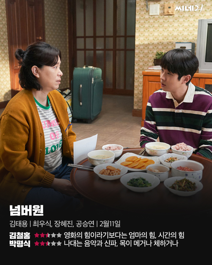 밥을 짓는 일과 먹는 일. 그리고 살아남는 일. 지난 세대 어머니들의 삶을 곡진하게 담아낸 이 작품은 이 땅의 아들들이 어머니에게 보내는 반성문이자 연가다. 보육원에서 자랐고 스무해 동안 어머니를 만나지 않았지만, 이 영화를 준비하면서 어머니를 모시고 살기로 결심 했다는 김태용 감독은 촬영 직전 어머니의 부고를 받았다. 그때 감독이 맞닥뜨렸을 감정은 영화 구석구석에 서려 있다. 아버지와 형을 잃고 피붙이라고는 엄마밖에 남지 않은 하민의 눈앞에 자꾸만 떠오르는 숫자도, 그 숫자가 없어지면 엄마마저 잃게 된다는 강박적인 믿음도 허무맹랑하게 들리지만은 않는다. <거인>의 소년 영재를 연기했던 최우식이 10여년의 세월이 지나 <넘버원>의 성인 하민으로 다시 한번 등장한 것은 감독의 작품 세계를 관통하는 울림을 준다. 휴먼드라마의 문법에 충실한 영화로 다소 전형적으로 느껴질 수 있는 부분이 있지만, 김태용 감독이 연출했기에 조금 다르게 다가온다. 설 명절에 극장가를 찾아온 간만의 전통적인 가족영화로, 곁에 있는 이들에 대한 사랑과 소중함을 새삼 느낄 수 있을 것이다.