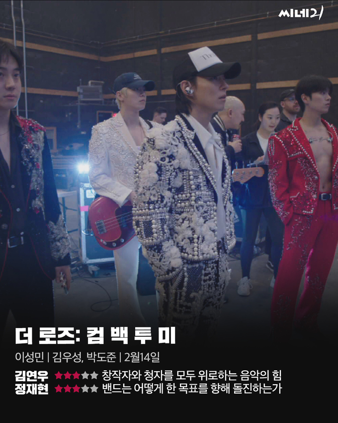 음악이 좋아 K팝 그룹 연습생이 됐지만 훈련 시스템이 자신들과 맞지 않는다고 느낀 네 청년. <더 로즈: 컴 백 투 미>는 그들이 만나 밴드 ‘더 로즈’를 결성하고, 우여곡절 끝에 2024년 코첼라 무대에 서는 시점까지를 다룬다. 멤버들의 심도 있는 인터뷰가 주를 이루며 투어 비하인드 클립이나 수년 전 버스킹 영상 등을 다양하게 첨가한다. 때로 삽입되는 애니메이션이 극에 색을 더한다. 영화는 더 로즈가 지나온 여정을 그리며 소속사와 아티스트간의 불균형 계약을 비롯한 이슈들을 경유하되 음악과 삶을 대하는 밴드의 태도를 중점적으로 담는다. 대규모 페스티벌에 참가하는 마음가짐을 ‘커다란 버스킹 무대에 서는 느낌’으로 표현하며 스스로 정한 길을 따라 곡을 만들고 공연하는 더 로즈는 자신들은 음악의 치유성을 믿는다고 이야기한다. 특히 팬들에게 뜻깊은 선물이 되리라 짐작한다.