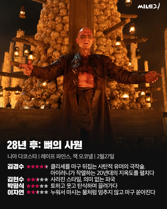 <28년 후: 뼈의 사원>은 <28년 후>의 엔딩에서부터 사건이 바로 이어지는 새로운 이야기의 2편이자, 전체 시리즈 중에선 4편 격이다. 전편에서 엄마를 잃고 떠돌이 생활을 하던 스파이크(앨피 윌리엄스)는 지미(잭 오코넬)가 이끄는 집단 ‘핑거스’를 만나 이들과 함께 지내기 시작한다. 그런데 이들은 스파이크에게 불필요한 폭력을 강요한다. 좀비에 맞선 어쩔 수 없는 선택이 아니라 멀쩡한 사람들까지 끔찍하게 해코지하는 핑거스의 모습을 본 스파이크는 크게 실망한다. 한편 스파이크의 엄마를 비롯해 바이러스 참사 이후 죽은 이들을 기리며 홀로 살아가던 켈슨 박사(레이프 파인스)는 알파라 불리는 거구의 좀비가 자신이 쏜 진통제에 중독되는 듯한 반응을 보이자, 실험 삼아 그를 길들이려 한다. 무리를 이끄는 당위성을 점점 잃어가던 지미는 어떤 위기의 순간에 켈슨 박사가 사는 곳을 지나치게 된다. 지미를 따르던 일원들이 켈슨을 보고 메시아라 여기기 시작하자, 지미는 모종의 음모를 꾸민다. 혼돈스러운 멸망의 시대에 각자의 방식으로 살아남은 사람들이 결속을 다지기보다 서로를 파괴하기 급급하다. 이번 영화는 지금껏 유지해온 거대한 세계관에 속한 새로운 일부를 보여주는 대신, 전편에 등장했던 인물들 위주로 각자의 이야기를 마무리 지으려는 인상이 강하다. 그런데 캐릭터들의 급작스러운 변화가 어색하고, 인물 개개인의 성장이나 화해 없이 허탈하게 퇴장하거나 의미 없는 파국을 맞게 된다. 스파이크나 켈슨이 얼마나 어렵고 간절하게 생존을 바라왔는지 지켜봐온 관객 입장에선 허탈하다. 다만 좀비 바이러스에 대해서는 희망적인 여운을 남겨둔 채 마지막 3편으로 바통을 넘긴다.
