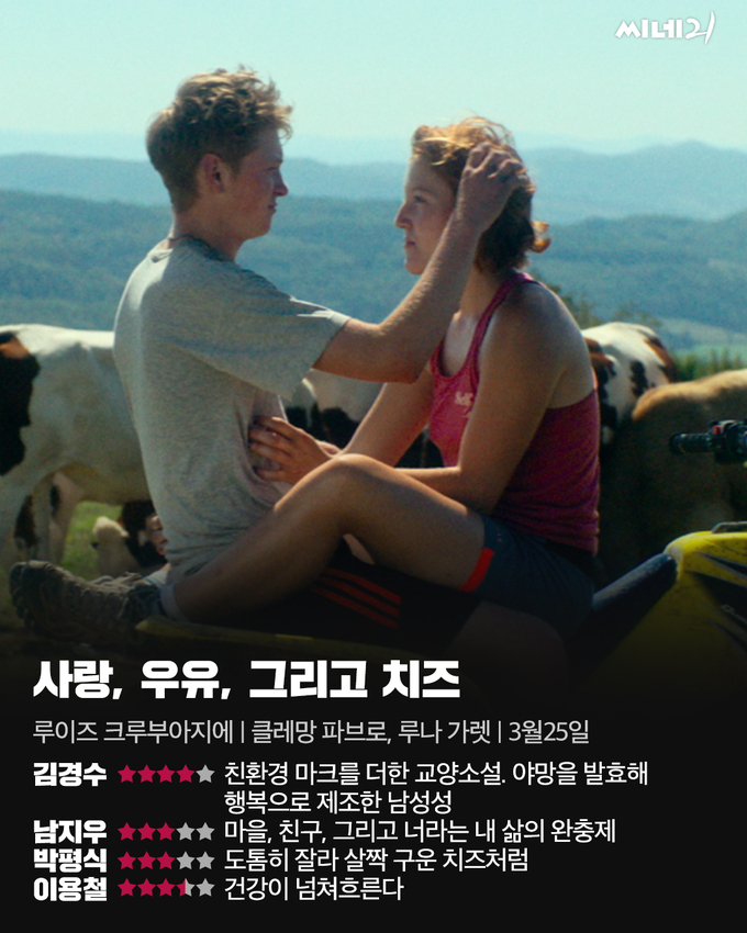 밤새 춤을 추고 술을 마시며, 운이 좋은 날에는 여자와 하룻밤을 보내기도 하는 18살 토톤(클레망 파브로)의 일상은 아버지의 죽음으로 하루아침에 바뀐다. 젖소를 길러 우유와 치즈를 생산하는 낙농업으로 굴러가는 이 작은 동네에서, 소년은 프랑스 최고의 콩테 치즈를 만들어 삶의 난관을 극복해보려 한다. <사랑, 우유, 그리고 치즈>로 장편 데뷔한 루이즈 크루부아지에 감독은 자신이 자란 농촌 지역 쥐라를 배경으로 한 이 영화를 2024년 칸영화제 주목할 만한 시선 부문에서 처음 소개한 뒤, 프랑스 전역에서 95만명 이상의 관객을 모은 바 있다. 치즈 만들기라는 독특한 소재를 상실과 가난, 그리고 첫사랑의 이야기로 너르게 풀어낸 이 작품은 국내 영화계에서는 좀처럼 보기 힘든 농촌 멜로의 풍경을 볏짚처럼 따뜻하고 폭신한 질감으로 그려낸다.