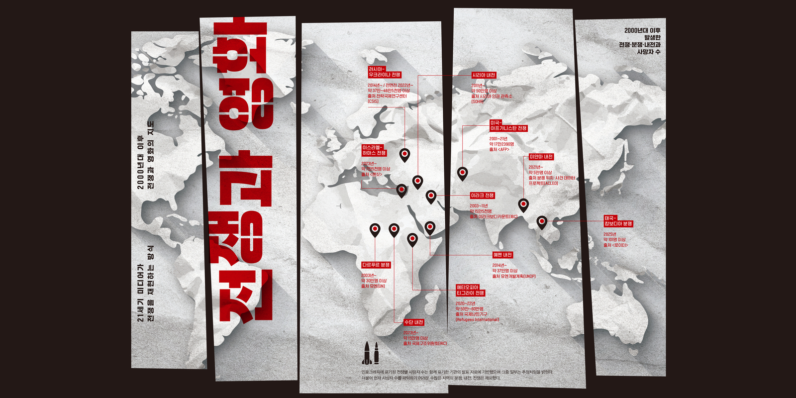 최소 175명. 미국의 미사일 공습으로 사망한 이란 호르모즈간주 여자초등학교 학생 수다. <뉴욕타임스>는 미군의 표적 설정 오류로 인한 사고라는 예비조사 결과를 발표하며 “최근 수십년간 발생한 가장 참혹한 미 군사적 실수 중 하나로 기록될 것”이라 전했다. 백악관은 책임을 통감하고 있을까. 백악관의 엑스(X) 계정엔 게임 <콜 오브 듀티: 모던 워페어3>, 영화 <아이언맨>등 전투 신을 미군의 이란 폭격과 교차편집한 숏폼 영상이 주기적으로 게시되고 있다. 이란의 사상자 수치는 매일 경신되나 반대편에선 이를 승패의 이분법적 구조 안에서 게임과 다름없는 일종의 유희 거리로 소비 중인 것이다. SNS에선 전시 상황 푸티지를 가공한 AI 영상까지 실시간으로 확산되고 있다. 러시아-우크라이나 전쟁, 이스라엘-하마스 전쟁, 동남아시아, 아프리카의 내전과 분쟁이 기약 없이 이어지는 현재, 도처의 전란을 우리는 어떤 시선으로 바라보고 있는가. 카메라를 매개로 분란을 기록한 영상물들엔 어떤 의도가 담겼나. <씨네21>은 동시대 영상매체가 전쟁을 다루는 방식에 관해 살피는 특집을 마련했다. 21세기 미디어가 전쟁을 재현하는 방식이 어떻게 변화했는지를 짚는 글을 필두로 2000년대 이후의 전시 상태를 스크린으로 옮긴 영화를 소개하고, 최근 영화제·시상식에서 주최측과 영화인들이 전쟁에 반응해온 상황에 관해서도 정리했다. 생존을 장담할 수 없는 긴박한 상황에도 카메라를 켠 기록자들과 전쟁에 관해 언급하길 자제하는 일부 영화제 주최측의 태도 차이가 작품과 발언 곳곳에 드러난다.