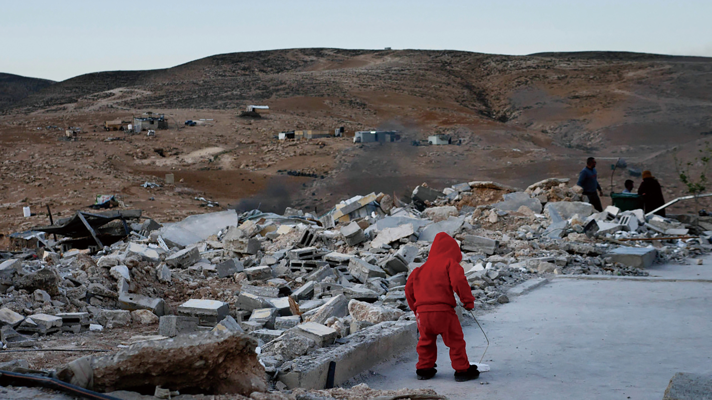 <노 어더 랜드>에서 가장 무시무시한 이미지는 마을에 침입한 이스라엘군의 불도저가 허허벌판에 자리한 작은 건물을 무참히 밀어버리는 장면이다. “우리 집을 부수고 있어!”라는 팔레스타인 주민들의 다급한 외침과 함께 등장한 이미지는 영화 내내 마을에 남은 다른 집들 장면에서도 계속된다. 끔찍한 건 비탄을 자아내던 극단적 사건의 이미지가 어느덧 영화 안에서 저항할 수 없는 일상의 풍경으로 자리한다는 점이다. 후반부에는 매일 한채씩 불도저에 무너지는 집 이미지들만 이어붙인, 철거 몽타주 시퀀스라고 부를 만한 대목이 나오기에 이른다. 인간의 집이 지닌 맥락과 세부를 모조리 단번에 짓밟아 ‘무’로 되돌리는 맹목적이고 파괴적인 절멸의 움직임. 주민들이 이스라엘군의 액션에 대응하는 방식은 이 순간을 카메라로 쫓아 기록하고 집이 무너지기 직전에 세간살이를 꺼내 바깥으로 옮기고 다시 집 짓기를 멈추지 않는 것이다.
