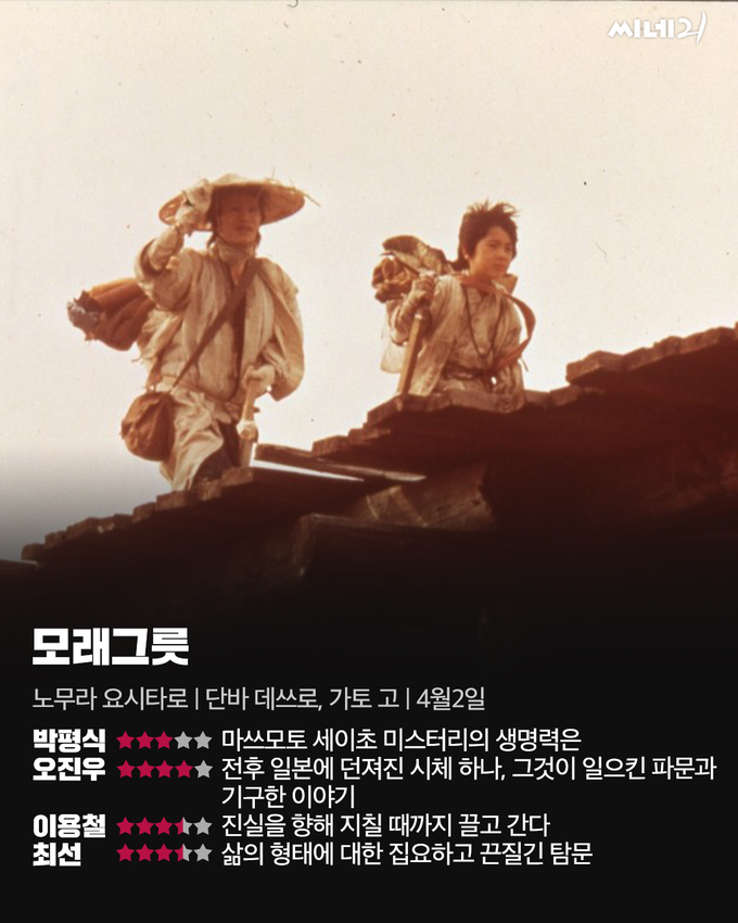 1971년 도쿄, 국철 조차장에서 변사체가 발견된다. 피해자가 젊은 남성과 함께 방문했던 주점의 직원들은 이들이 나눈 대화에서 도호쿠 지방 말씨와 ‘카메다’라는 단어를 기억한다. 형사 이마니시(단바 데쓰로)와 요시무라(모리타 겐사쿠)는 그 희미한 단서를 좇는다. 느린 호흡의 수사극 <모래그릇>이 형사의 시점을 따라 풀어나가는 것은 ‘범인은 누구인가’보다는 ‘범인은 왜 그렇게까지 했는가’에 가깝다. <잠복근무>(1958)부터 <미주 지도>(1983)까지, 노무라 요시타로 감독이 마쓰모토 세이초의 소설을 바탕으로 연출한 여러 편의 영화 중 하나로, 52년 만에 HD 리마스터링 버전으로 국내 개봉한다. 영화 <모래그릇>은 원작의 방향성을 고려하되 디테일을 대폭 생략하고 후반부를 멜로드라마틱하게 재구성해 감성에 호소하기를 택한다.