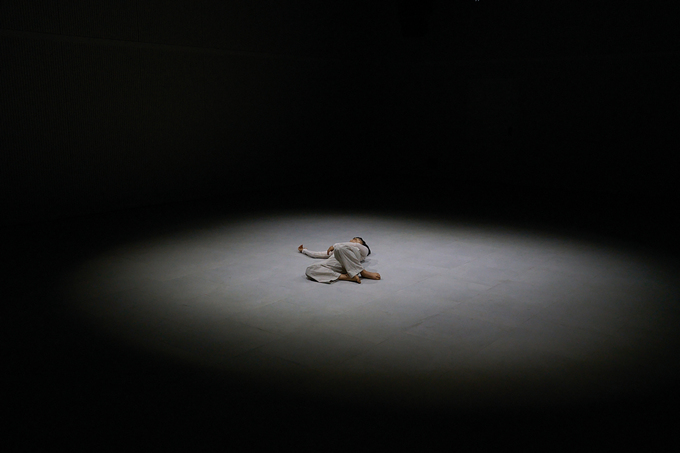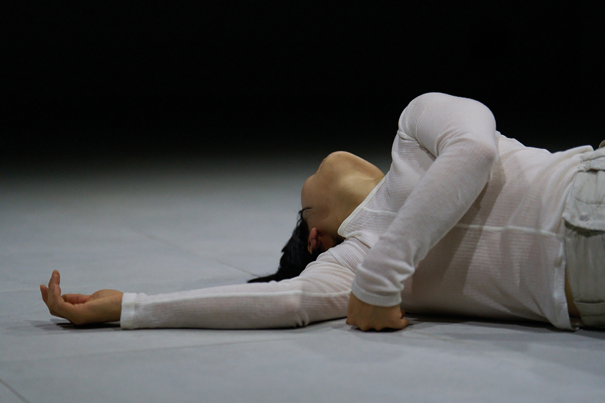 이쯤이면 됐겠지, 싶은 순간을 지나쳐 호흡은 혹은 호흡으로서의 몸은 더, 더, 나아간다. 힘으로 밀어붙여서는 담이 걸리거나 뼈에 금이 가거나 목구멍이나 폐가 손상되기 쉬워 보일 정도로 격렬하게 확장되거나 수축하는 순간도 있는데, 아마 퍼포머는 지속적인 탐색과 훈련을 통해 강제적이지 않은 방식으로 몸 스스로가 스스로의 한계를 넘어서도록 추동하는 방식을 터득한 것 같다. 몸은 스스로 자신을 열고 인정하고 받아들임으로써 오히려 과감하게 더 깊고 넓고 때론 더 구석진 곳까지 나아간다. 시간이 지날수록 바닥에 앉아 있는 관객들 주위로 몸 사이사이로 구멍들 속으로 공기가, 물이, 파도가 드나든다. 관객의 몸이 서서히 흔들린다. 척추에 힘이 풀리고 고개가 기울어진다. 휘어지고 돌아가다 다시 세워지고 다시 무너진다.