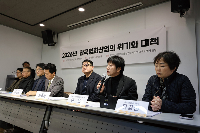 4월9일 ‘2026년 한국 영화산업의 위기와 대책’ 정책 제안 기자회견이 열렸다. 영화산업의 건전성과 수익성을 회복하기 위한 “스크린 집중 제한 제도와 홀드백 정상화, 대형·중급 규모 펀드 조성 및 이를 위한 정부의 세제 혜택 정책” 등을 주장했다. “영화진흥위원회와 문화체육관광부, 국회가 영화계의 절박한 제안에 귀를 열어주기를 바란다”라는 기자회견 취지가 설명됐다. 봉준호·정지영·양우석·윤가은·임순례 감독, 이동하 한국영화프로듀서조합 대표, 김원국 하이브미디어코프 대표 등 45명이 정책 제안자로 이름을 올렸다. 한국독립영화협회·한국영화제작가협회·한국영화프로듀서조합 등 13개 영화 단체와 영화인 581명이 정책 제안에 서명했다. 김병인 한국시나리오작가협회 이사장, 김승범 나이너스엔터테인먼트 대표, 박경신 변호사, 박관수 한국영화프로듀서조합 부대표, 양우석 감독, 이은 한국영화제작가협회 회장, 황경선 애니메이션 제작자가 발언자로 나섰다.