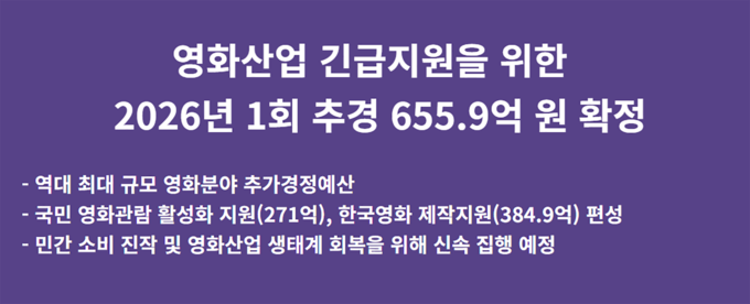 4월10일 국회 본회의에서 확정된 ‘2026년 제1회 추가경정예산안’을 통해 ‘영화산업 긴급지원’ 예산 655.9억 원이 수혈된다. 주요 사업은 ‘극장 할인쿠폰’으로 불리는 ‘국민 영화관람 활성화 지원’(271억 원)과 ‘한국영화 제작지원’(384.9억)이다.