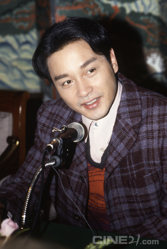 배우이자 가수인 장국영이 영화 <백발마녀전>과 <아비정전>에서 직접 부른 주제곡들을 모은 새 앨범 《총애》 홍보차 내한해 기자회견 중이다.