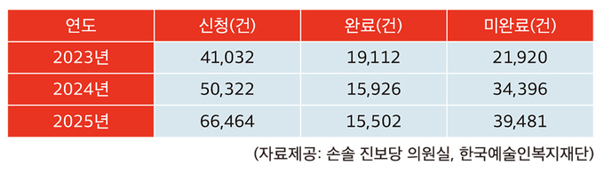 서류 보완에 주어지는 기한이 점점 짧아지고 있다는 점도 문제다. 2024년 12월 발표한 ‘예술활동증명 신청 안내서 E-BOOK’에 따르면 보완 가능 기한이 14일이었지만 현재는 7일로 줄었다. 여기에 더해 한국예술인재단은 최근 팝업창 공지를 통해 올해 1월12일 이후 신청 건부터는 “정량 충족 건에 한하여 보완 요청”하겠다고 밝혔다. 필수자료가 부족한 경우 보완 요청 없이 불인정하겠다는 것이다. “2026년 3개월 동안 3만8천건 이상 신청되어 전년도 대비 3배 이상 폭증했다”는 게 그 근거다. 예술활동증명의 행정검토 보완 기간은 법으로 따로 정해져 있지는 않지만, 7일간 단 1회만 보완 가능하다는 조건은 긴 시간 기다린 예술가들에게 시간을 촉박하게 주고, 제도 밖으로 쳐내는 밀어내기처럼 보인다. 게다가 1년 주기로 제대로 된 설명 없이 보완 가능 기한을 줄여온 것도 문제다.