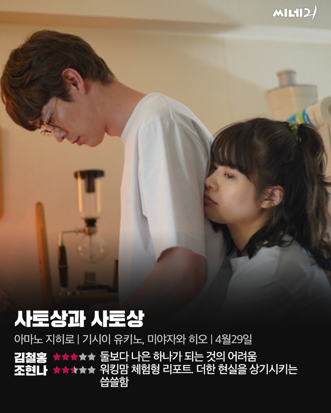 두 주연배우의 힘으로 이끌어가는 영화다. <너의 눈을 들여다보면>에서 눈과 귀를 사로잡은 복싱 리듬을 보여준 바 있는 배우 기시이 유키노가 이번 영화에선 미야자와 히오 배우와 날 선 대화를 주고받는다. 주도적이고 행동이 앞서는 사치, 그리고 그 반대의 성향을 가진 타모츠의 15년간의 세월을 훌륭하게 표현해냈다. 다소 노골적이고 예측된 방향으로 흘러가는 영화지만, <사토상과 사토상>엔 누군가들의 진짜 시간이 담겨 있는 게 분명하다.