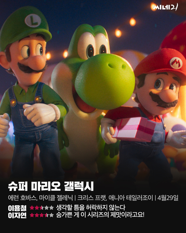 “옛날 옛날 한 옛날에 버섯 왕국의 수호자인 피치 공주가 있었습니다.” 잠자리를 뒤척이는 별들(루마)에게 동화책을 읽어주는 로젤리나 공주는 갑작스레 왕국을 침범한 괴상한 로봇에 납치당한다. 괴한의 정체는 쿠파 주니어. 전편 <슈퍼 마리오 브라더스>에서 땅콩버섯을 먹고 힘을 잃어 피치 성에 감금된 쿠파의 아들로, 아버지를 구출하고 세계를 정복하려는 음모를 꾸민다. 한편 히어로 배관공으로 거듭난 마리오와 루이지 형제는 모래 왕국에서 민원을 해결하던 중 귀여운 공룡 요시를 만나게 된다. 전 세계 흥행 수익 13억달러, 메가 히트 애니메이션의 속편은 닌텐도 위(Wii) 게임 <슈퍼 마리오 갤럭시> 시리즈를 기본 세계관으로 장착했다. 전편보다 더 숨 가쁘고 더 정신없어졌지만, 버섯을 먹고 배관으로 이동하는 친숙한 장면에 이번에도 향수에 빠지고 만다.