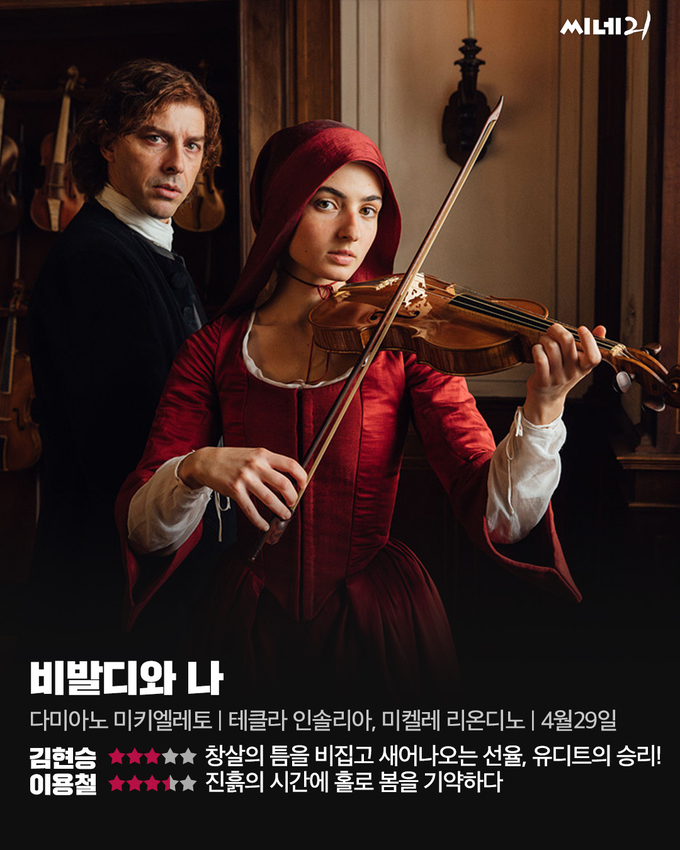 18세기 초 베네치아, 뛰어난 오케스트라로 명성이 높은 피에타 보육원. 감미로운 선율로 가득한 겉모습과 달리 소녀들은 엄격한 규율 속에 살아간다. 체칠리아(테클라 인솔리아)는 매일 밤 어머니가 돌아오길 기도하지만, 성인이 된 그녀에게 남은 선택지는 얼굴도 모르는 남자와의 결혼뿐이다. 희망이 서서히 체념으로 기울어가던 무렵, 새로 부임한 음악 교사 비발디(미켈레 리온디노)가 그녀의 재능을 알아본다. <비발디와 나>는 오페라 연출가 출신 다미아노 미키엘레토 감독의 영화 데뷔작이다. 적재적소에 배치된 음악이 대화의 여백을 메우며 서사의 리듬을 단단히 조율한다. <햄넷>처럼 거장의 이름을 전복하는 데까지 나아가진 못하지만, 억압된 환경 속에서 예술적 열망이 싹트는 과정을 지켜보는 것만으로도 충분히 가슴을 뜨겁게 달군다.